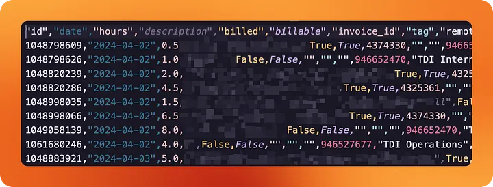 And in fact, looking into data/activities/, we're able to see a CSV file containing all our tracked hours since we started the company.